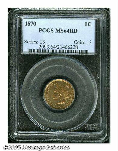 <B>1870<1C> MS64 Red PCGS.</B></I> Olive-gold hues dominate this crisply struck and lustrous near-Gem, although the portrait has a blush of fire-red color. Without remotely relevant carbon or marks. Population: 60 in 64, 33 finer (3/05).