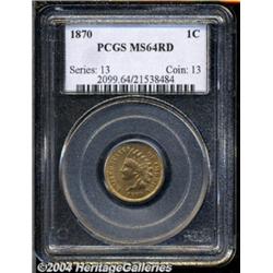 <B>1870<1C> MS64 Red PCGS.</B></I> Typically struck on the feathertips of the headdress, and on the reverse details, with rich red coloration and gleaming luster. There faint die clash marks (as struck) on the obverse, but the surfaces are otherwise nearly flawless. Population: 53 in 64, 32 finer (3/04). <BR><BR><B>Important notice:</B> Heritage usually auctions material at the rate of 200-250 lots per hour. On some occasions eBay Live bid software or the Internet may not be able to keep up with the pace of the auction. We recommend placing a realistic absentee bid now as insurance to avoid disappointment. Occasionally the auctioneer may eliminate or reject an eBay Live bid, and the auctioneer may also reopen a lot after the close of the eBay live bidding (usually because we missed an audience bid), and may reject your bid even if it shows you as the winning bidder. By bidding via eBay Live, you agree that Heritage may award the lot to another bidder at its sole discretion under the circumstances described above or any other reasonable circumstances. Since eBay bids are not shown to us until we open the lot on the floor, we treat those bids just like floor bids. In most cases the floor responds before the eBay bid is presented to us, due to Internet lag time, so for consistency we have made it a policy that floor bids are always considered first over tie eBay live bids. Also please note that all Heritage lots purchased through eBay Live carry a 20% Buyer's Premium. Please make sure you read the Terms and Conditions before you bid. </span></font></tr></table></td></tr></table>