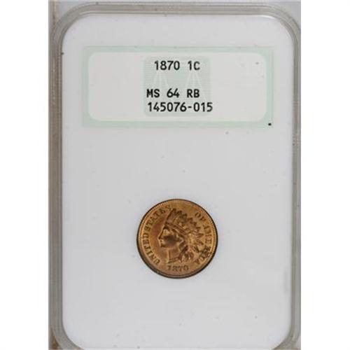 <B>1870 1C MS64 Red and Brown NGC.</B></I> Bold N in ONE. Snow's repunched date obverse 3 with a die crack beneath portrait, but no die doubling is seen on the reverse. A well struck near-Gem that has smooth surfaces and minimal carbon. Mostly straw-gold with brown toning on the cheek and near the I in AMERICA. In a prior generation NGC holder.<BR><BR><B>Coin Engraver:</B> James B. Longacre<BR><BR><b>Shipping:</b> Coins & Currency (<a target="_blank" href="http://www.heritageauctions.com/common/shipping.php">view shipping information</a>)