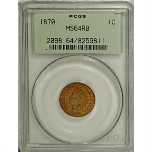 <B>1870 1C MS64 Red and Brown PCGS.</B></I> Sharply defined with nearly full frosty mint luster on both sides, retaining considerable orange mint color, blending to light brown, with hints of emerald-green toning.<BR><BR><B>Coin Engraver:</B> James B. Longacre<BR><BR><b>Shipping:</b> Coins & Currency (<a target="_blank" href="http://www.heritageauctions.com/common/shipping.php">view shipping information</a>)