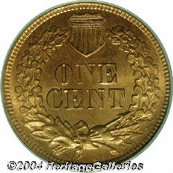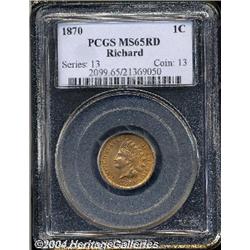 <B>1870<1C> MS65 Red PCGS.</B></I> Ex: Richard Collection. A crisply struck Gem with pleasing cartwheel luster and lovely orange-gold color. The virtually unabraded surfaces provide exceptional eye appeal. The C in CENT is clashed near the bridge of the Indian's nose, and the chin and lips are doubled. A splendid representative of this scarce lower mintage date. Population: 28 in 65, 4 finer (9/04). <BR><BR><B>Important notice:</B> Heritage usually auctions material at the rate of 200-250 lots per hour. On some occasions eBay Live bid software or the Internet may not be able to keep up with the pace of the auction. We recommend placing a realistic absentee bid now as insurance to avoid disappointment. Occasionally the auctioneer may eliminate or reject an eBay Live bid, and the auctioneer may also reopen a lot after the close of the eBay live bidding (usually because we missed an audience bid), and may reject your bid even if it shows you as the winning bidder. By bidding via eBay Live, you agree that Heritage may award the lot to another bidder at its sole discretion under the circumstances described above or any other reasonable circumstances. Since eBay bids are not shown to us until we open the lot on the floor, we treat those bids just like floor bids. In most cases the floor responds before the eBay bid is presented to us, due to Internet lag time, so for consistency we have made it a policy that floor bids are always considered first over tie eBay live bids. Also please note that all Heritage lots purchased through eBay Live carry a 20% Buyer's Premium. Please make sure you read the Terms and Conditions before you bid.