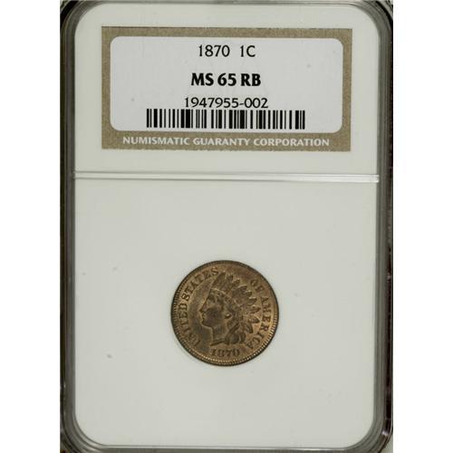 <B>1870 1C MS65 Red and Brown NGC.</B></I> Shallow N in ONE. An unabraded and satiny piece with a nearly full red reverse. The obverse is also more red than brown, although the left field and the cheek are mellowed. Moderate carbon decides the grade.<BR><BR><b>Shipping:</b> Coins & Currency (<a target="_blank" href="http://www.heritageauctions.com/common/shipping.php">view shipping information</a>)