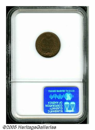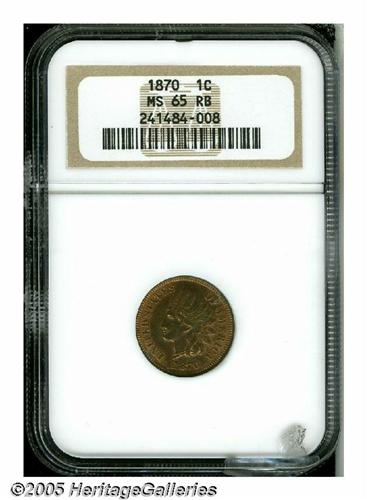 <B>1870<1C> MS65 Red and Brown NGC.</B></I> Sharply struck and lustrous, with steel-green toning in the centers, and electric-orange coloration near the peripheries. Two or three small obverse marks fail to prevent the Gem grade assessment. Population: 76 in 65 Red and Brown, 12 finer in Red and Brown (3/05).
