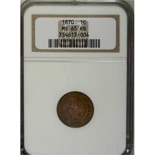 <B>1870 1C MS65 Red and Brown NGC.</B></I> Lustrous golden-brown surfaces show splashes of crimson on the obverse device. Boldly struck throughout with just a touch of softness on the tips of the feathers. An elegant example, devoid of any overt flaws. Census: 81 in 65 Red and Brown, 14 finer (3/08).<BR><BR><B>Coin Engraver:</B> James B. Longacre<BR><BR><b>Shipping:</b> Coins & Currency (<a target="_blank" href="http://www.heritageauctions.com/common/shipping.php">view shipping information</a>)