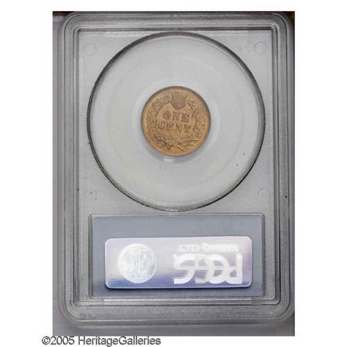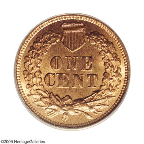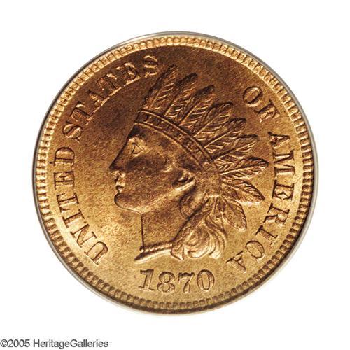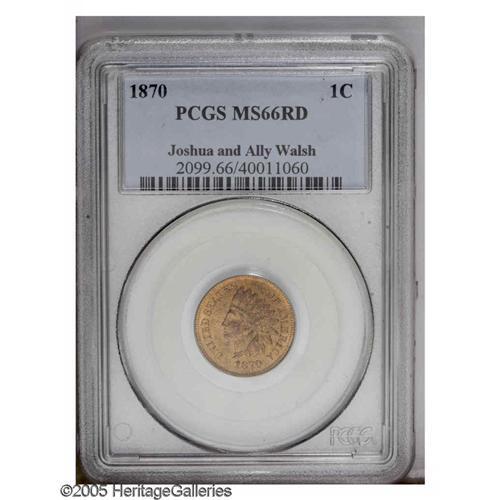 <B>1870<1C> MS66 Red PCGS.</B></I> Ex: Ally Collection. After William Barber took over the job of Chief Engraver after Longacre's untimely death the previous year, he made slight modifications to the reverse hub. Without going into detail, this single year is represented by three different hub varieties. This particular coin was struck from the newer hub which is immediately recognizable by the strong N at the bottom of ONE. The obverse is especially well struck, with only slight softness evident on the shield on the upper reverse. Orange-red and cherry-red coloration is intermixed over both sides and the coin is well balanced in appearance. There are no obvious abrasions on either side and just a few specks of deeper color are evident on the obverse. Population: 4 in 66, none are finer (11/05).<BR><I>From The Joshua and Ally Walsh Collection of United States Cents.</B></I>
