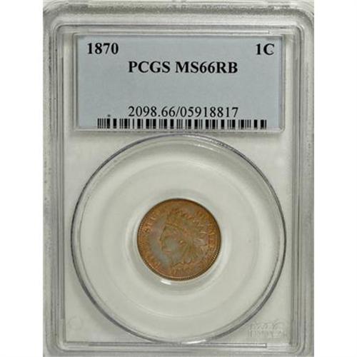 <B>1870 1C MS66 Red and Brown PCGS.</B></I> Shallow N. This exquisite Premium Gem has vibrant luster and a crisp strike. Orange and plum-red dominate the reverse, while the obverse has gold legends and a gunmetal-blue field and portrait.<BR><BR><B>Coin Engraver:</B> James B. Longacre<BR><BR><b>Shipping:</b> Coins & Currency (<a target="_blank" href="http://www.heritageauctions.com/common/shipping.php">view shipping information</a>)