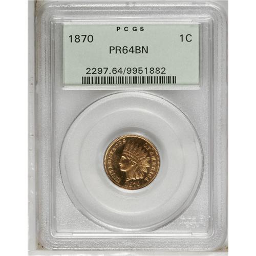 <B>1870<1C> PR64 Brown PCGS.</B></I> Lightly dipped with bright orange color, thus the "brown" designation for this green-label PCGS example. A few darker toning spots are evident in the obverse field. This is still an attractive example with sharp design features and nicely mirrored fields.