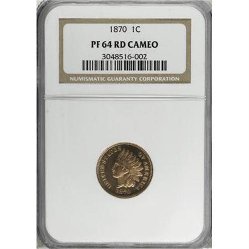 <B>1870 1C PR64 Cameo NGC.</B></I> All of the design elements are fully struck, with intense reflectivity noted in the fields, and mild mint frost on the devices. A lovely cameo effect is created on both sides. Well preserved from harmful contact, with scattered carbon specks that prevent an even higher grade assessment. <BR><BR><b>Shipping:</b> Coins & Currency (<a target="_blank" href="http://www.heritageauctions.com/common/shipping.php">view shipping information</a>)
