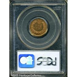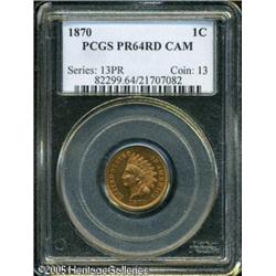 <B>1870 1C PR64 Red Cameo PCGS.</B></I> An enchanting early proof that is almost devoid of surface distractions. Lustrous with slightly muted, orange-red color, the boldly struck features reveal modest brightness as the coin turns into the light, and frosted devices are contrasted over the moderately reflective fields. There are a number of scattered flyspecks on the reverse. A number of mint made die striations are plentiful over each side. Population: 4 in 64 Red Cameo, 3 finer (1/05). Lot:5291