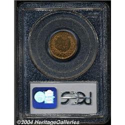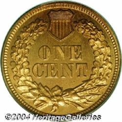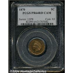 <B>1870<1C> PR64 Red Cameo PCGS.</B></I> An enchanting early proof that is almost devoid of surface distractions. Lustrous with slightly muted, orange-red color, the boldly struck features reveal modest brightness as the coin turns into the light, and frosted devices are contrasted over the moderately reflective fields. There are a number of scattered flyspecks on the reverse. A number of mint made die striations are plentiful over each side. Population: 5 in 64 Red Cameo, 3 finer (9/04). <BR><BR><B>Important notice:</B> Heritage usually auctions material at the rate of 200-250 lots per hour. On some occasions eBay Live bid software or the Internet may not be able to keep up with the pace of the auction. We recommend placing a realistic absentee bid now as insurance to avoid disappointment. Occasionally the auctioneer may eliminate or reject an eBay Live bid, and the auctioneer may also reopen a lot after the close of the eBay live bidding (usually because we missed an audience bid), and may reject your bid even if it shows you as the winning bidder. By bidding via eBay Live, you agree that Heritage may award the lot to another bidder at its sole discretion under the circumstances described above or any other reasonable circumstances. Since eBay bids are not shown to us until we open the lot on the floor, we treat those bids just like floor bids. In most cases the floor responds before the eBay bid is presented to us, due to Internet lag time, so for consistency we have made it a policy that floor bids are always considered first over tie eBay live bids. Also please note that all Heritage lots purchased through eBay Live carry a 20% Buyer's Premium. Please make sure you read the Terms and Conditions before you bid.