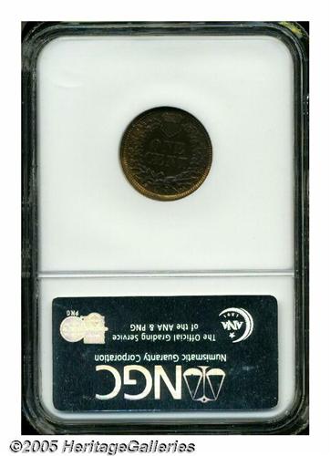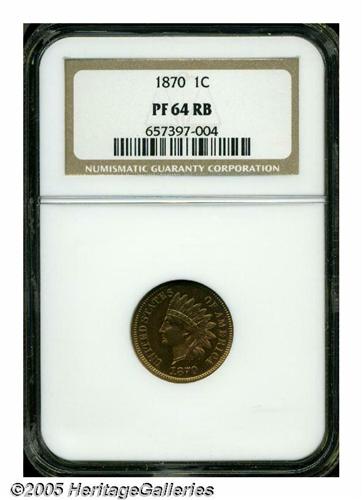 <B>1870<1C> PR64 Red and Brown NGC.</B></I> This meticulously struck Choice Cent has a full Red obverse, although a hint of carbon is present. The reverse presents gold borders with an interior of deep apple-green and plum toning. All proof Cents prior to 1878 are scarce.