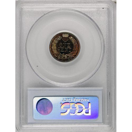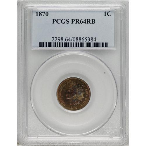 <B>1870 1C PR64 Red and Brown PCGS.</B></I> A medley of orange-tan, sky-blue, crimson, and yellow-gold toning enriches both obverse and reverse, and a well executed strike leaves sharply defined devices, including crispness on the feather tips and on all four diamonds. Moderately mirrored fields accentuate the motifs when the coin is tilted beneath a light source. No significant contact marks or unsightly spots are evident. Population: 67 in 64 Red and Brown, 34 finer (4/07).<BR><BR><b>Shipping:</b> Coins & Currency (<a target="_blank" href="http://www.heritageauctions.com/common/shipping.php">view shipping information</a>)