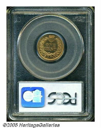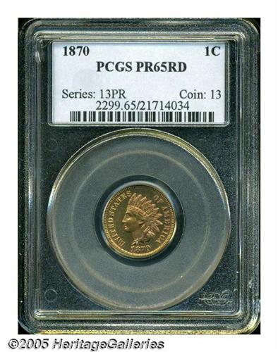 <B>1870<1C> PR65 Red PCGS.</B></I> An enchanting early Gem proof that is almost devoid of surface distractions. Both sides show lime-green color in the fields and golden toning on the devices. Population: 22 in 65 Red, 4 finer (4/05).
