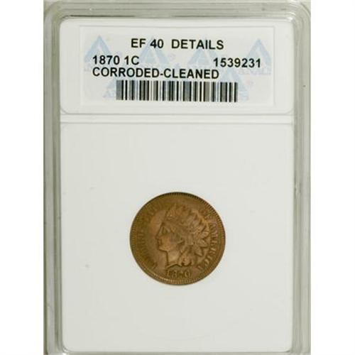 <B>1870 1C --Cleaned, Corroded--ANACS. XF40 Details.</B></I> NGC Census: (14/184). PCGS Population (22/154). Mintage: 5,275,000. Numismedia Wsl. Price for NGC/PCGS coin in XF40: $283. (#2097)<BR><BR><B>Coin Engraver:</B> James B. Longacre<BR><BR><b>Shipping:</b> Coins & Currency (<a target="_blank" href="http://www.heritageauctions.com/common/shipping.php">view shipping information</a>)