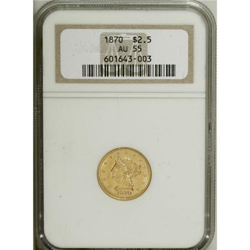 <B>1870 $2 1/2 AU55 NGC.</B></I> Bright yellow-gold surfaces retain ample luster, and exhibit well defined motifs. A few minor marks are entirely consistent with the grade.<BR><I>From The Twin Hollows Collection, Part Two.</B></I><BR><BR><b>Shipping:</b> Coins & Currency (<a target="_blank" href="http://www.heritageauctions.com/common/shipping.php">view shipping information</a>)