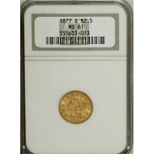 <B>1870 $2 1/2 AU55 NGC.</B></I> A scarce low mintage issue, with only 4,555 pieces originally coined. Lightly worn with bright yellow-orange surfaces and moderate scattered abrasions.<BR><BR><b>Shipping:</b> Coins & Currency (<a target="_blank" href="http://www.heritageauctions.com/common/shipping.php">view shipping information</a>)
