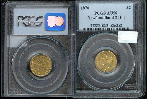 1870 "2 Dot" $2 Nfld Gold PCGS AU-58, well struck with strong lustre. A very nice example.