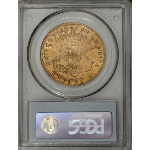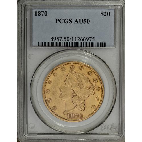 <B>1870 $20 AU50 PCGS.</B></I> This briefly circulated Type Two twenty possesses a band of luster across each separate obverse star. On the reverse, luster dominates all but the open field. A couple of marks on the Motto are all that are worthy of mention. Population: 23 in 50, 60 finer (1/07).<BR><BR><b>Shipping:</b> Coins & Currency (<a target="_blank" href="http://www.heritageauctions.com/common/shipping.php">view shipping information</a>)