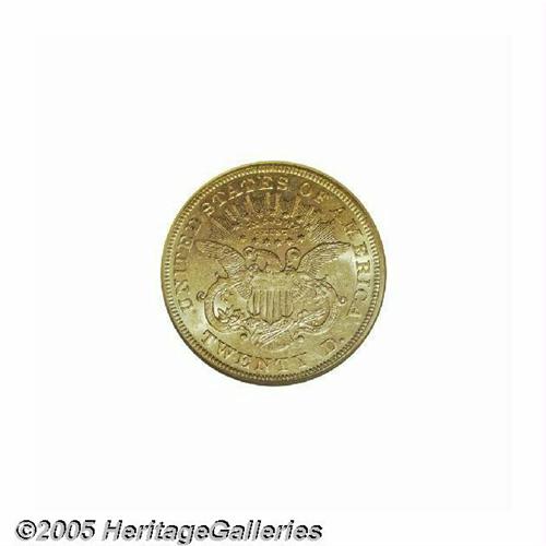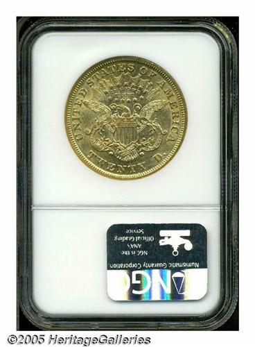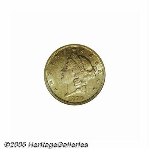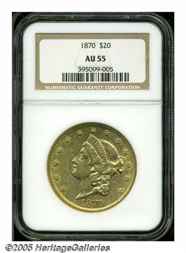 <B>1870<$20> AU55 NGC.</B></I> When available, this date is almost always only VF or XF. AU specimens are elusive, and Mint State specimens are rare. The Choice AU example offered in the present lot has bright apricot-gold patination and considerable luster in the recessed areas. The design features are well struck, with only portions of Liberty's hair displaying softness. Numerous contact marks are scattered about, particularly on the obverse. Population: 35 in 55, 56 finer (6/05).