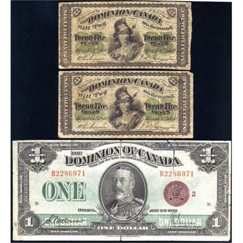 1870 Twenty-Five Cents, Series B, Small B, DC-1b, two notes, both VG. Plus 1923 One Dollar McCavour-Saunders Group 2 Bronze Seal Serial Number B2286971 B, VF with several paper splits and tears