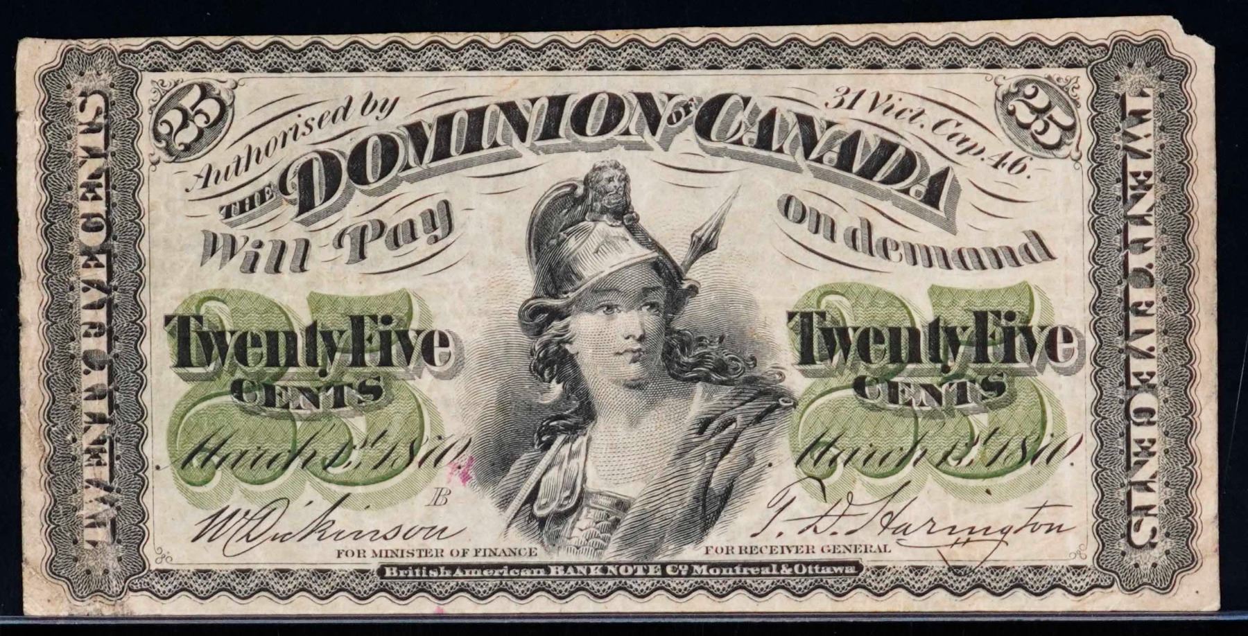 1870 25 Cents - Shinplaster DC-1b "Large B" VF example with small nick at upper right.