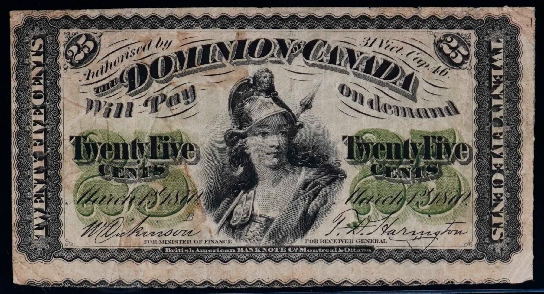 1870 25 Cents - Shinplaster DC-1b-i "Small B" Fine+ "Bottom note can be seen"