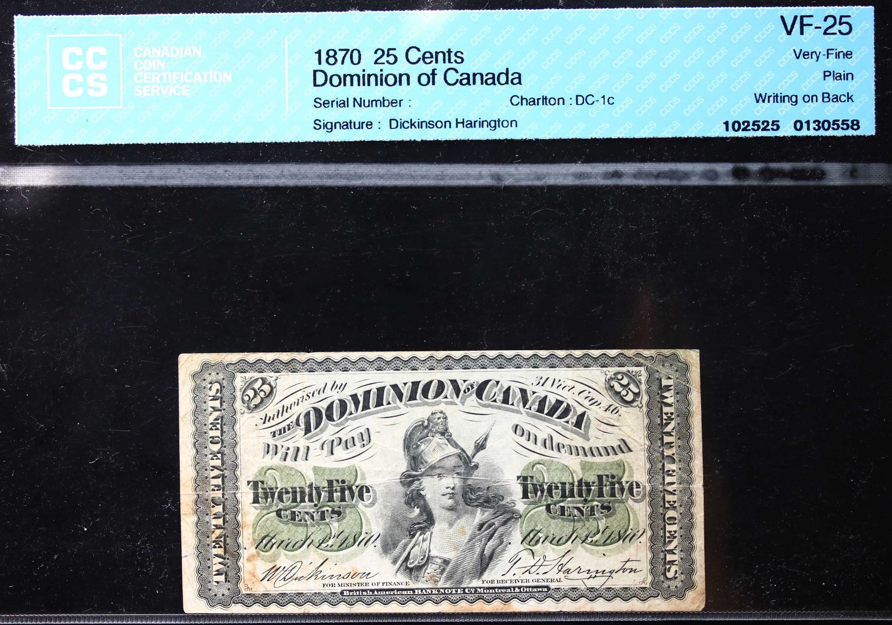 1870 25 Cents - Shinplaster DC-1c "Plain" CCCS VF25 writing on back.