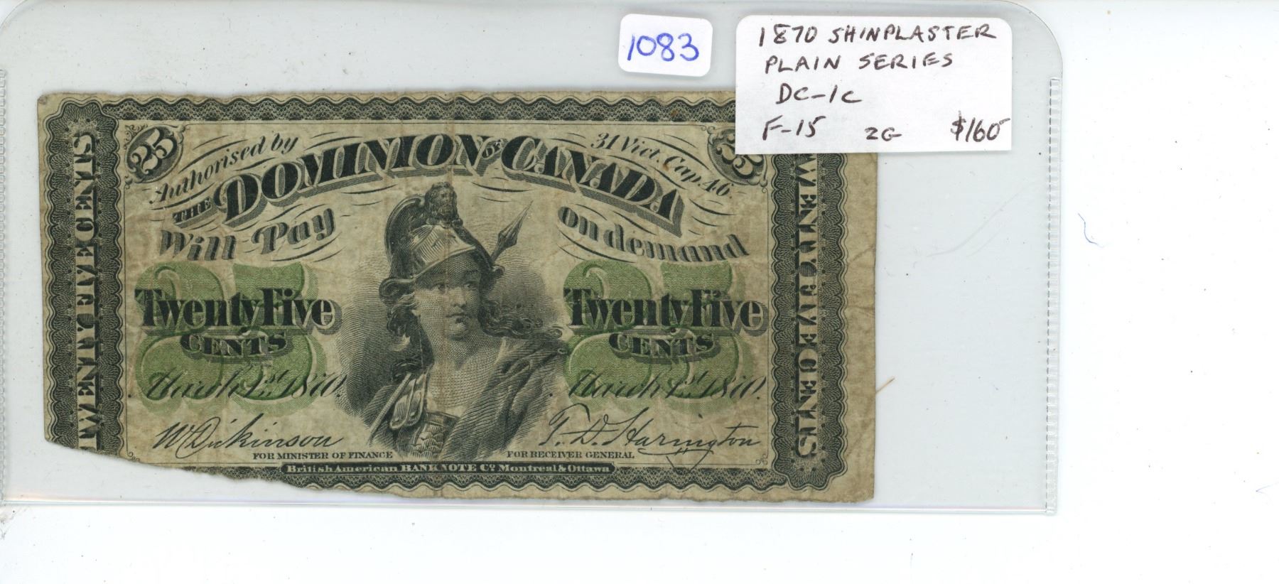 1870 25 Cents Shinplaster. Plain Series. Dickinson-Harrington signatures. DC-1c. F-15 with missing piece.