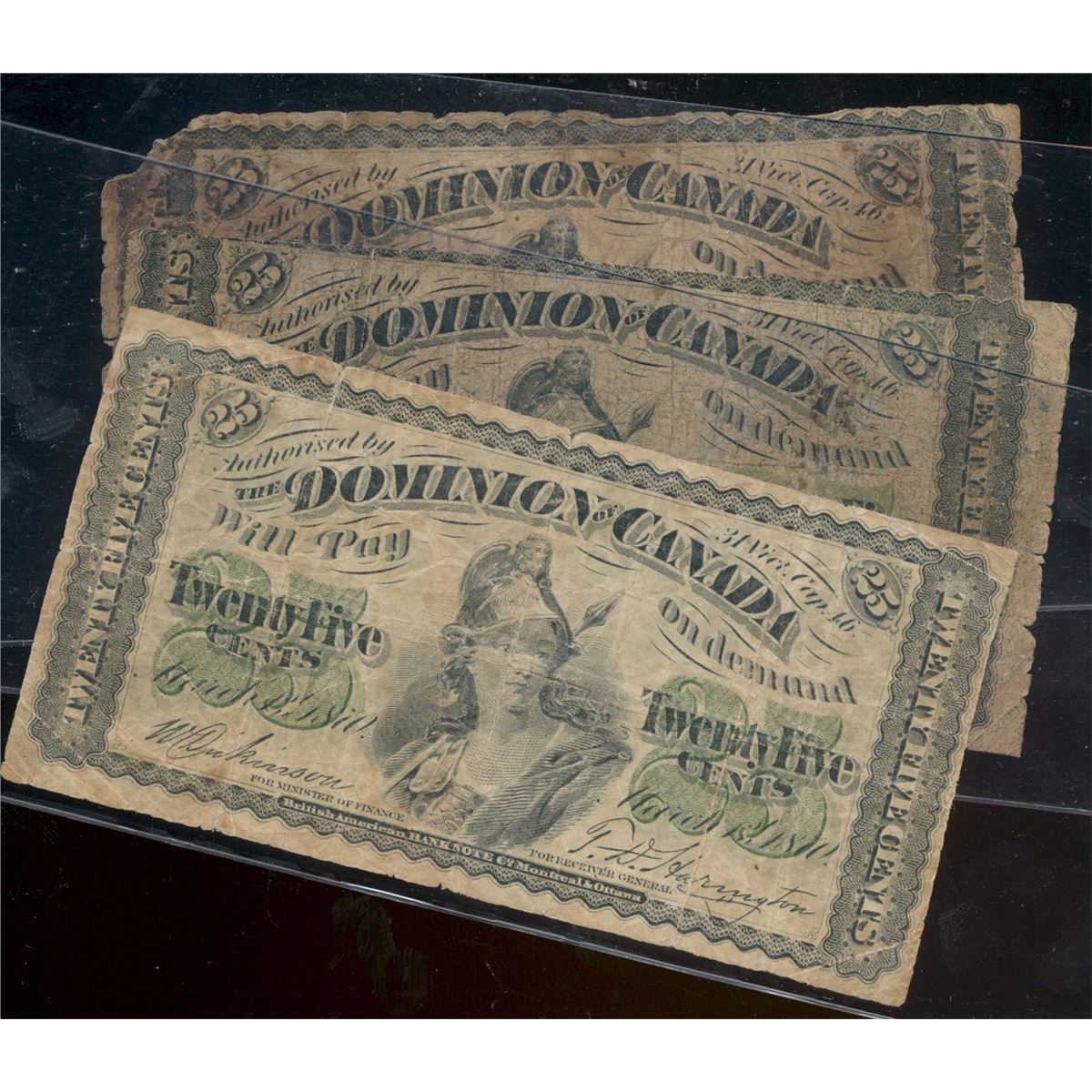 1870 25¢ DC-1a Ltr A, DC-1b Ltr b & DC-1c. Lot of 3 notes G to VG+ with Ltr A showing damage and tear.