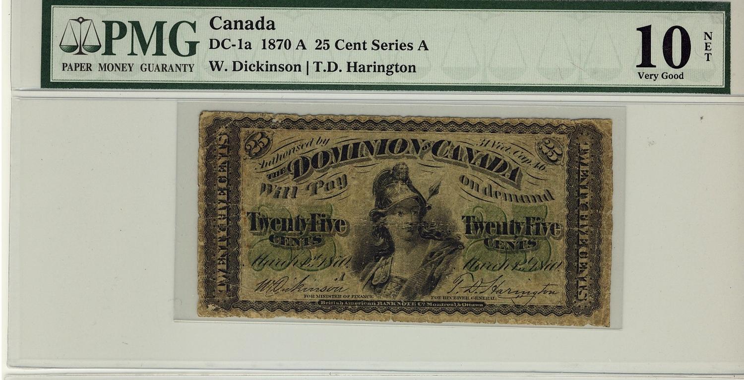 1870 25¢, DC-1a Series A, PMG VG10 Net. Light rust.