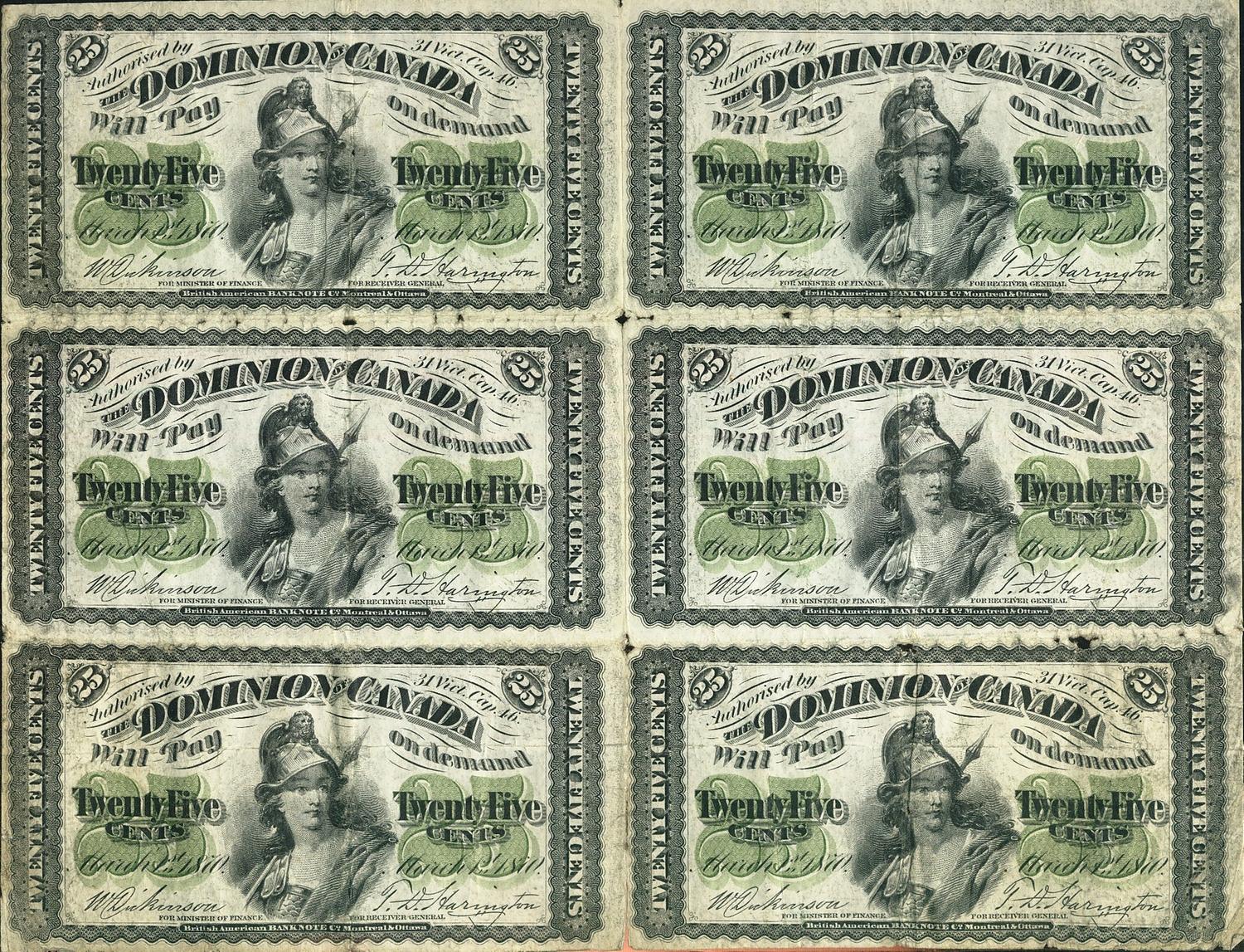 1870 25¢ DC-1s Sheet of 6 notes CCCS F15. Extremely rare and difficult to find remaining issues in sheets of six. Should be viewed.