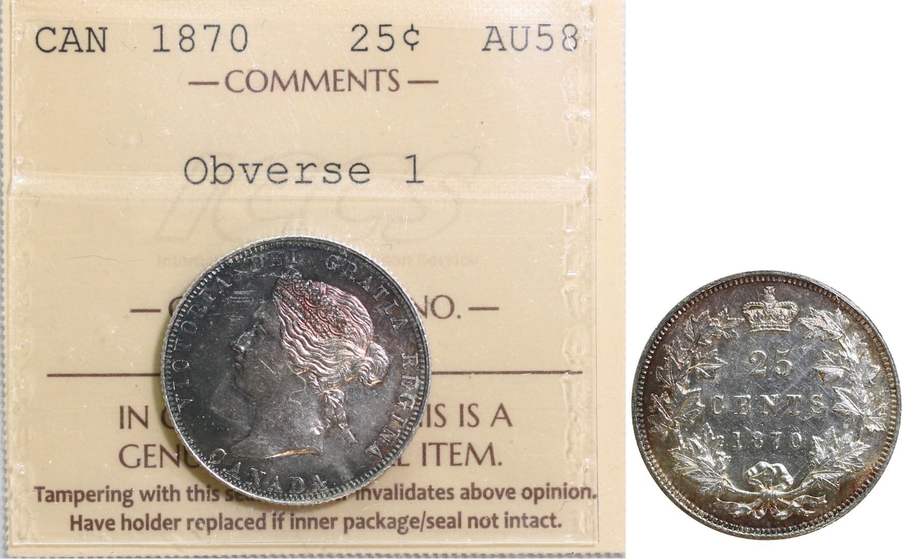 1870 25¢ "Obv.1" ICCS Choice About Uncirculated-58 Lustrous with attractive autumn shades.