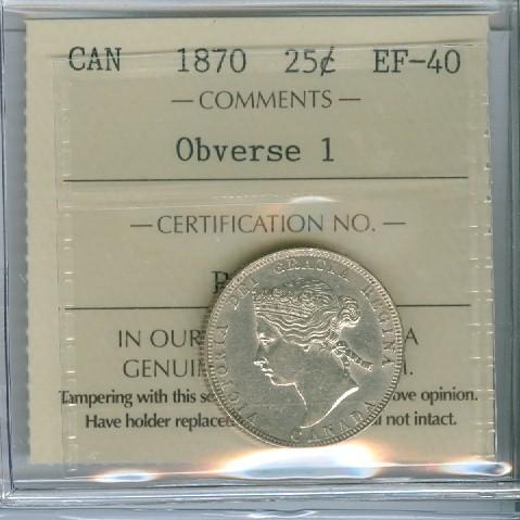 1870 25¢ Obv#1 ICCS EF40. White and lustrous.