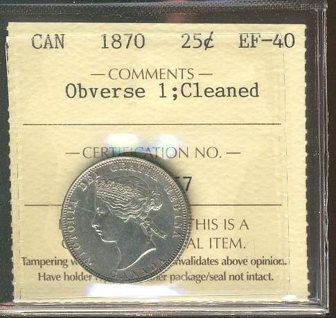 1870 25¢ Obv 1, ICCS EF40. With cleaned designation.