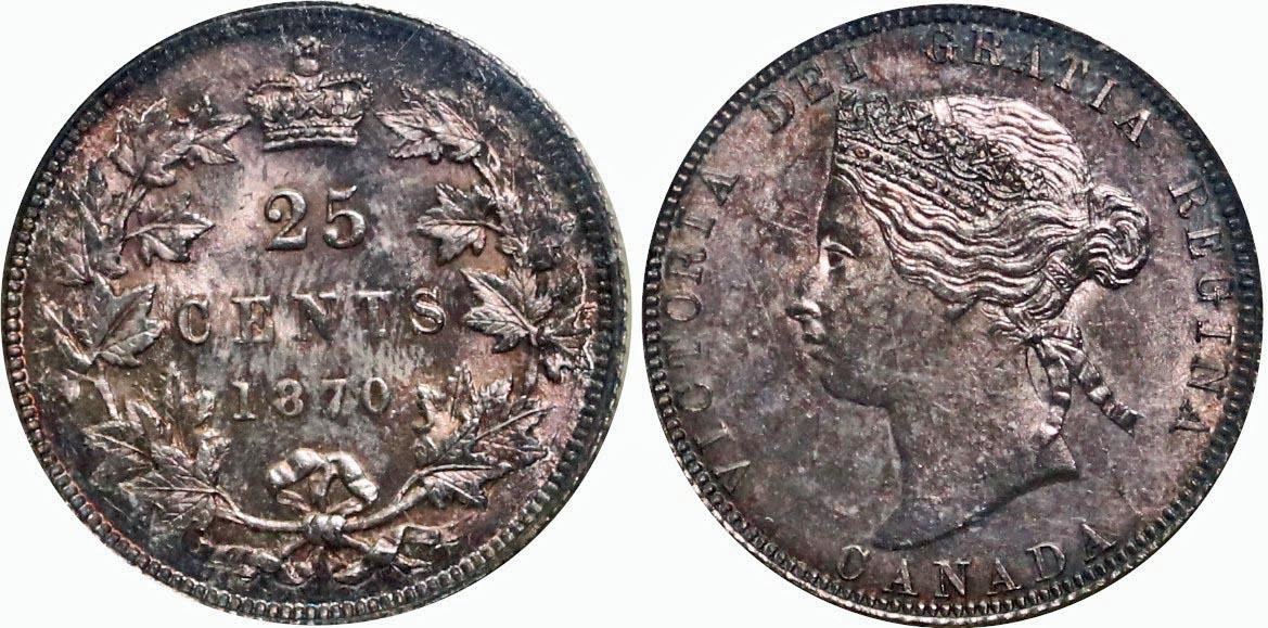 1870 25¢ Obv 1 ICCS Gem Mint State-65. A superb gem example displaying an array of silver and mauve tints over a fully detailed strike.