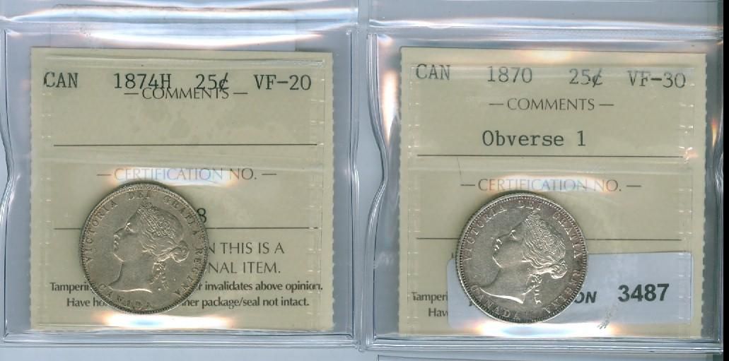 1870 25¢ Obv. port. #1. ICCS VF-30; 1874H. ICCS VF-20. Lot of two (2) coins, both lightly toned.