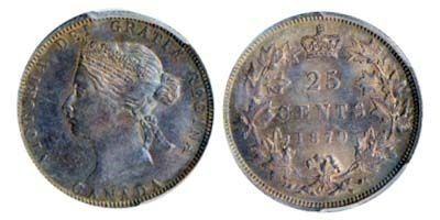 1870 25¢ PCGS MS62. Intense russet tones and strong lustre on rev.