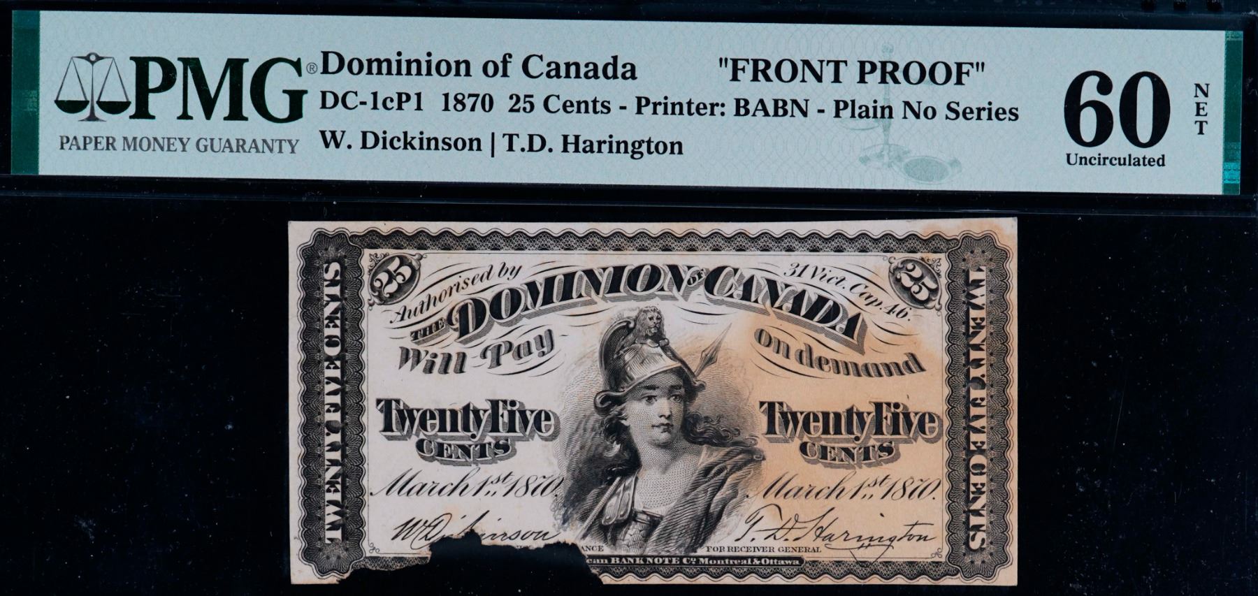 1870 25¢ "Shinplaster" - DC-1cP1 "Plain series" FRONT PROOF - PMG Uncirculated-60 with issues. Proof notes are rarely seen and offered.