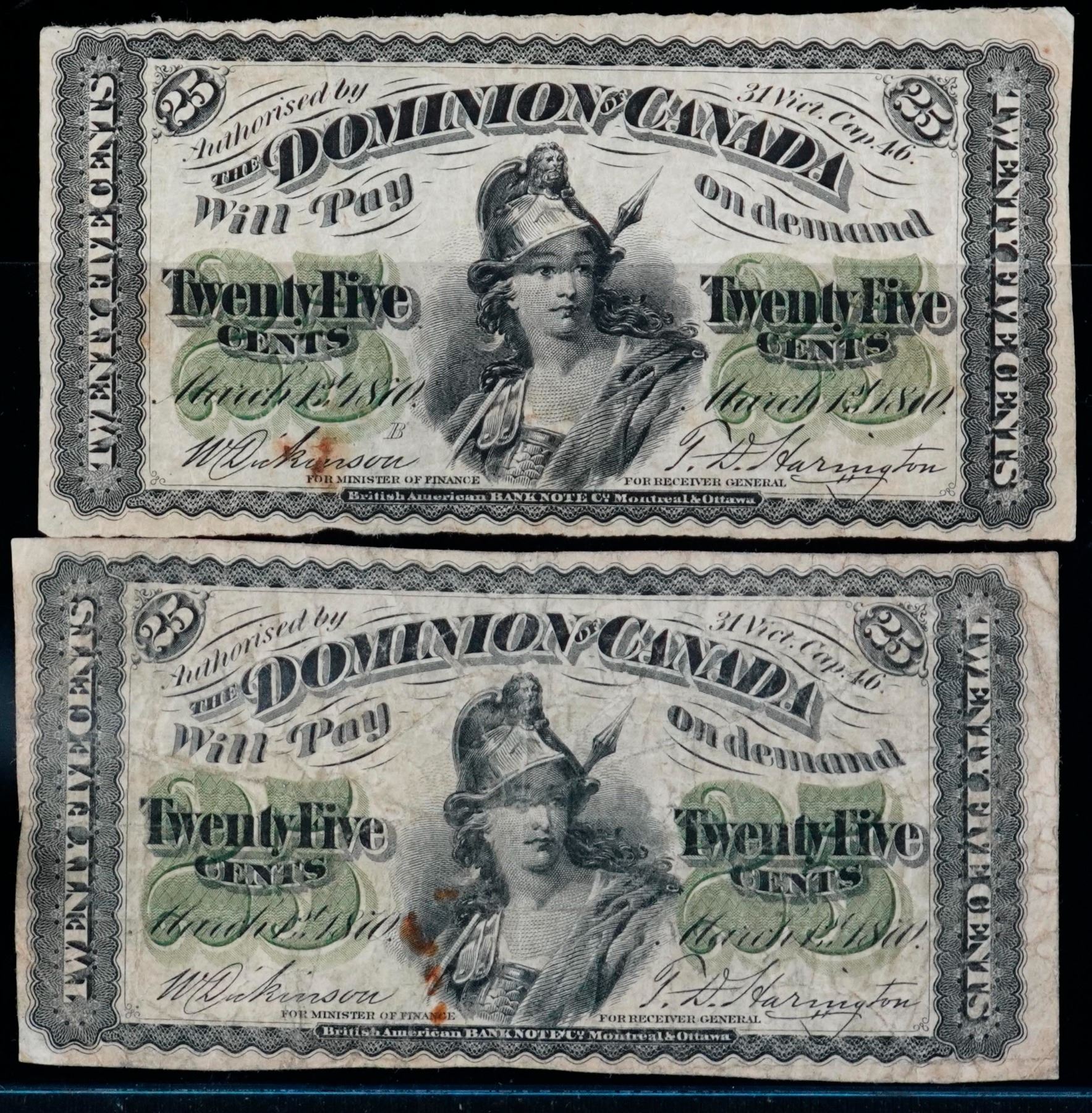 1870 25¢ Shinplasters DC-1b "Letter B" VG to Fine, lot of 2 notes.