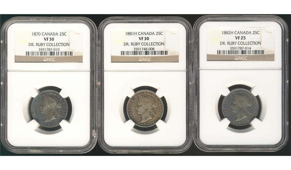 1870 25¢ VF30, 1881H VF30 & 1882H VF25. Lot of 3 NGC graded coins all part of the Dr. Ruby Collection.