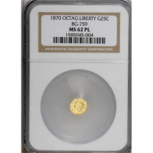 <B>1870 25C BG-759 MS62 Prooflike NGC.</B></I> NGC Census: (2/6). PCGS Population (0/0). (#710586)<BR><BR><b>Shipping:</b> Coins & Currency (<a target="_blank" href="http://www.heritageauctions.com/common/shipping.php">view shipping information</a>)