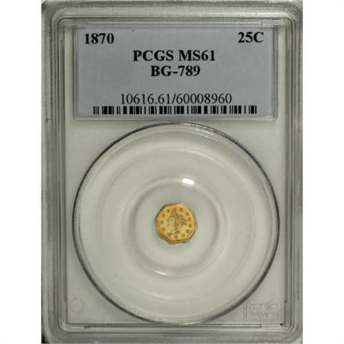 <B>1870 25C Goofy Head Octagonal 25 Cents, BG-789, R.4, MS61 PCGS.</B></I> . PCGS Population (5/56). NGC Census: (1/3). (#10616)<BR><BR><b>Shipping:</b> Coins & Currency (<a target="_blank" href="http://www.heritageauctions.com/common/shipping.php">view shipping information</a>)