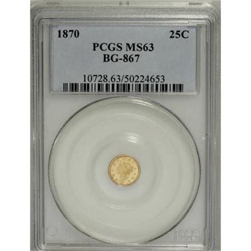 <B>1870 25C Goofy Head Round 25 Cents, BG-867, R.4, MS63 PCGS.</B></I> PCGS Population (16/9). NGC Census: (6/2). (#10728)<BR><BR><b>Shipping:</b> Coins & Currency (<a target="_blank" href="http://www.heritageauctions.com/common/shipping.php">view shipping information</a>)