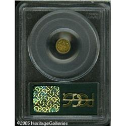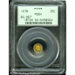 <B>1870 25C Goofy Head Round 25 Cents, BG-867, R.4, MS64 PCGS.</B></I> Nicely struck, with bright yellow-gold patina and greenish undertones. The design elements are well impressed. The coin and its PCGS holder are housed in a custom made light brown plastic holder, which is enclosed within a black box. Lot:9803