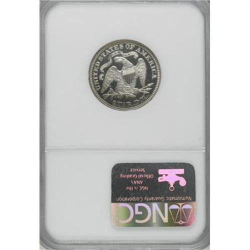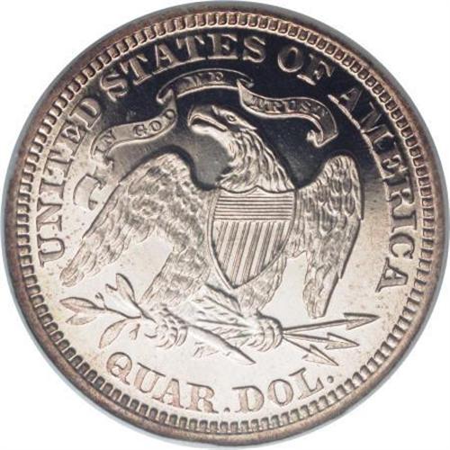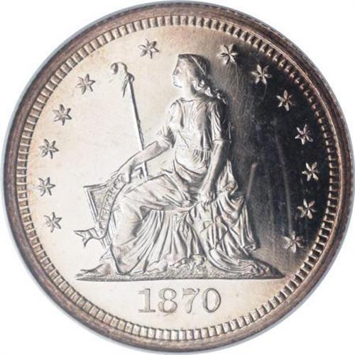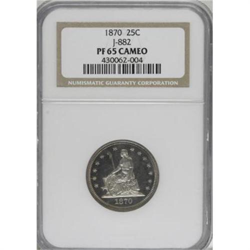 <B>1870 25C Quarter Dollar, Judd-882, Pollock-980, High R.7, PR65 Cameo NGC.</B></I> A regular issue Motto reverse quarter is paired with a William Barber rendition of the seated Liberty. She faces left and holds an olive branch and a Federal shield. A liberty pole passes behind (though apparently through) her arm. Struck in silver with a reeded edge. These patterns were sold as part of complete silver sets, and sets were available in silver, copper, and aluminum with either reeded or plain edges. This is an exceptionally pleasing Gem Cameo example that is mostly untoned with delicate rose patina surrounding the peripheries. The devices stand out in stark contrast to the unfathomable depth of reflectivity in the fields.<BR><BR><b>Shipping:</b> Coins & Currency (<a target="_blank" href="http://www.heritageauctions.com/common/shipping.php">view shipping information</a>)