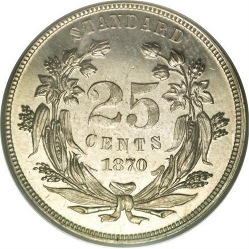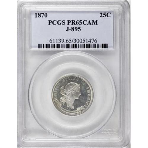 <B>1870 25C Standard Silver Quarter Dollar, Judd-895, Pollock-1002, Low R.7, PR65 Cameo PCGS.</B></I> A bust of Liberty faces right with UNITED STATES OF AMERICA around and IN GOD WE TRUST on a ribbon below. Liberty wears a diadem inscribed LIBERTY. The reverse shows 25 CENTS and the date 1870 within a wreath of cotton and corn with the inscription STANDARD above. Struck in silver with a plain edge. This generally brilliant Gem displays pleasing contrast between the portrait and obverse field.<BR><BR><b>Shipping:</b> Coins & Currency (<a target="_blank" href="http://www.heritageauctions.com/common/shipping.php">view shipping information</a>)