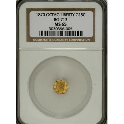 <B>1870 25C Liberty Octagonal 25 Cents, BG-713, R.4, MS65 NGC.</B></I> This unabraded and satiny tan-gold example is well struck for this lapped variety. A few specks of russet patina are present on the upper right reverse, and the portrait has a couple of minute aqua flecks. Census: 3 in 65, 3 finer (3/08).<BR><BR><b>Shipping:</b> Coins & Currency (<a target="_blank" href="http://www.heritageauctions.com/common/shipping.php">view shipping information</a>)
