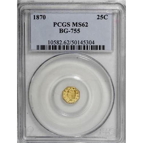 <B>1870 25C Liberty Octagonal 25 Cents, BG-755, High R.4, MS62 PCGS.</B></I> PCGS Population (14/5). NGC Census: (2/0). (#10582)<BR><BR><b>Shipping:</b> Coins & Currency (<a target="_blank" href="http://www.heritageauctions.com/common/shipping.php">view shipping information</a>)