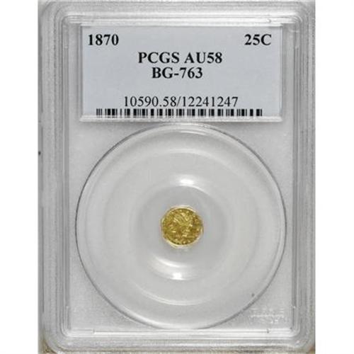 <B>1870 25C Liberty Octagonal 25 Cents, BG-763, Low R.4, AU58 PCGS.</B></I> . PCGS Population (23/73). NGC Census: (3/13). (#10590)<BR><BR><b>Shipping:</b> Coins & Currency (<a target="_blank" href="http://www.heritageauctions.com/common/shipping.php">view shipping information</a>)