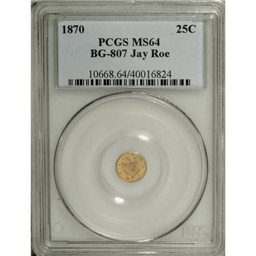 <B>1870 25C Liberty Round 25 Cents, BG-807, Low R.7, MS64 PCGS.</B></I> Ex: Jay Roe. This satiny apricot-gold near-Gem is mark-free and shows the expected slight sinking on the central reverse. The prominent die break through the reverse exergue likely explains the rarity of the variety. The plate coin for BG-807 in the second edition of Breen-Gillio. Population: 7 in 65, 1 finer (3/07).<BR><I>Ex: Jay Roe Collection (Bowers and Merena, 9/03), lot 287.</B></I><BR><BR><b>Shipping:</b> Coins & Currency (<a target="_blank" href="http://www.heritageauctions.com/common/shipping.php">view shipping information</a>)